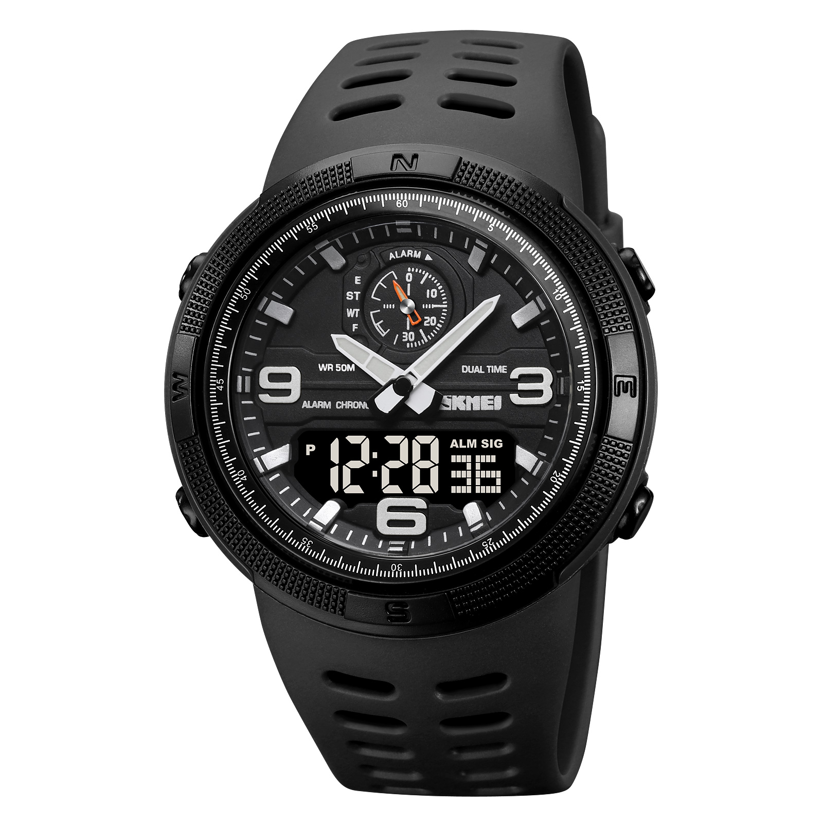 Skmei, механізм Кварцовий, корпус 50 х 50, матеріали Полімер / Каучук, колір Чорний, форма Кругла, стиль Спортивний, індикація Стрілочно-електронний, тип кріплення Ремінець, водозахист 50 м, скло Полімерне