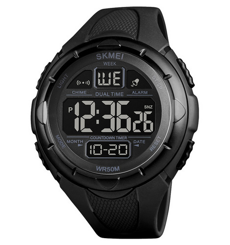 Skmei, механізм Від батарейки, корпус 46 х 51, матеріали Полімер / Поліуретан, колір Чорний, форма Кругла, стиль Тактичні, Спортивні, індикація Електронний, тип кріплення Ремінець, водозахист 5 ATM, скло Пластик