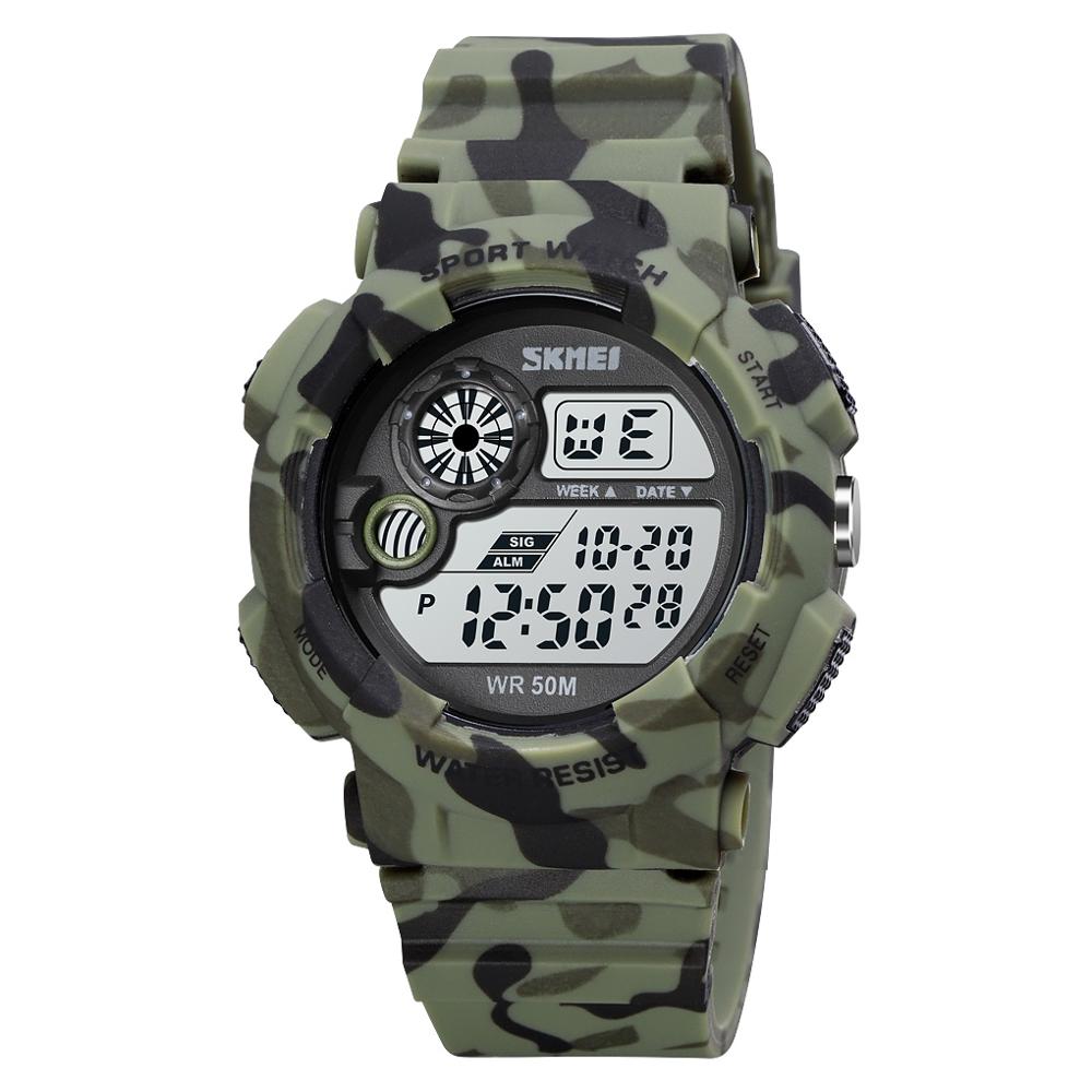 Skmei, механізм Електронний, корпус 49 х 44, матеріали Полімер, Каучук / Силікон, колір Камуфляж, форма Кругла, стиль Спортивний, Сasual, індикація Електронний, тип кріплення Ремінець, водозахист 50 м, скло Полімерне