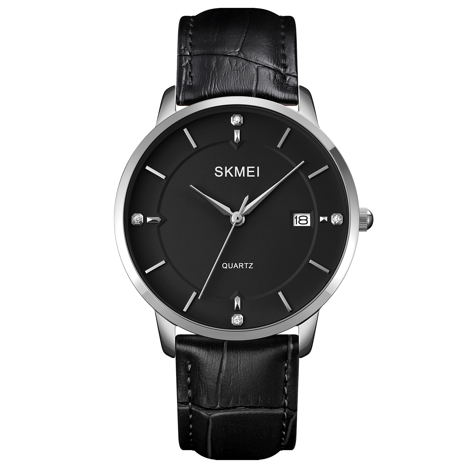 Skmei, механізм Кварцовий, корпус 40 х 38, матеріали Метал / Шкіра, колір Сріблястий / Чорний, форма Кругла, стиль Класичний, індикація Стрілочний, тип кріплення Ремінець, водозахист 30 м, скло Мінеральне