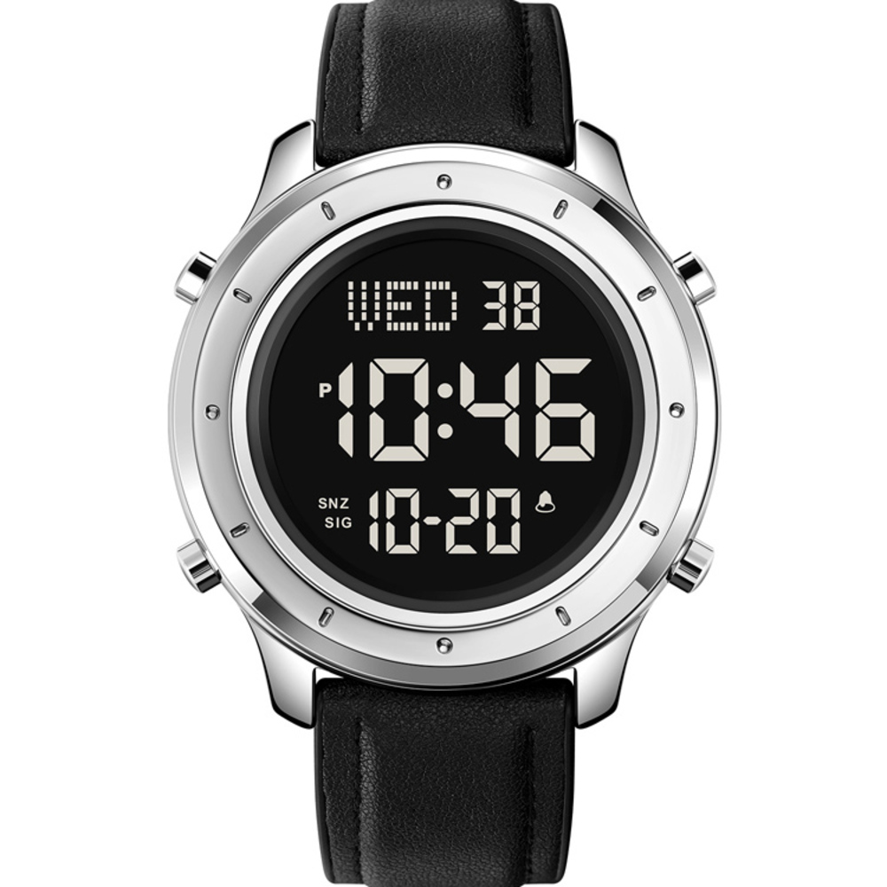 Skmei, механізм Електронний, корпус 53 х 47, матеріали Метал / Шкіра, колір Сріблястий / Чорний, форма Кругла, стиль Сasual, індикація Електронний, тип кріплення Ремінець, водозахист 30 м, скло Полімерне
