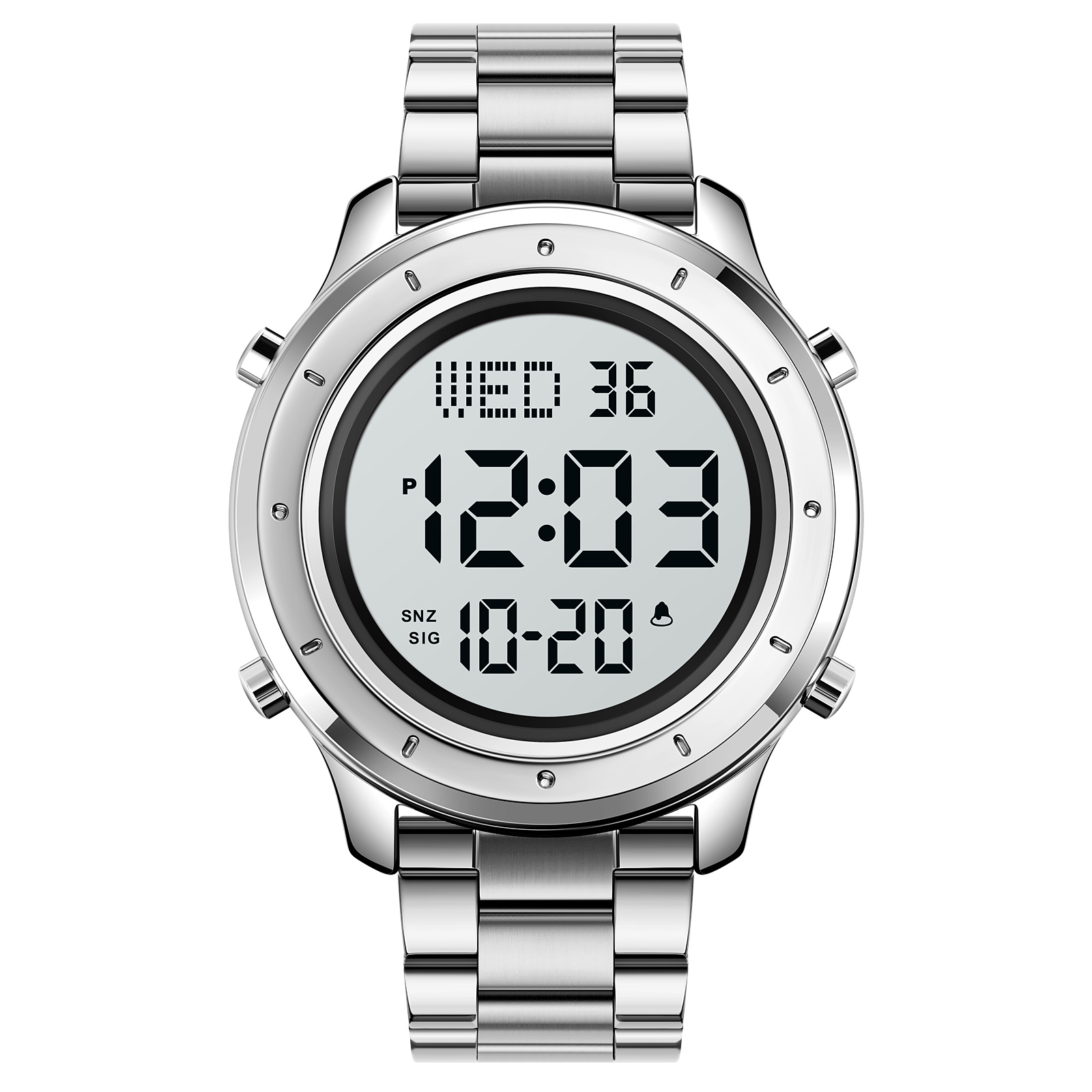 Skmei, механізм Електронний, корпус 53 х 47, матеріали Метал / Нержавіюча сталь, колір Сріблястий, форма Кругла, стиль Сasual, індикація Електронний, тип кріплення Браслет, водозахист 30 м, скло Полімерне