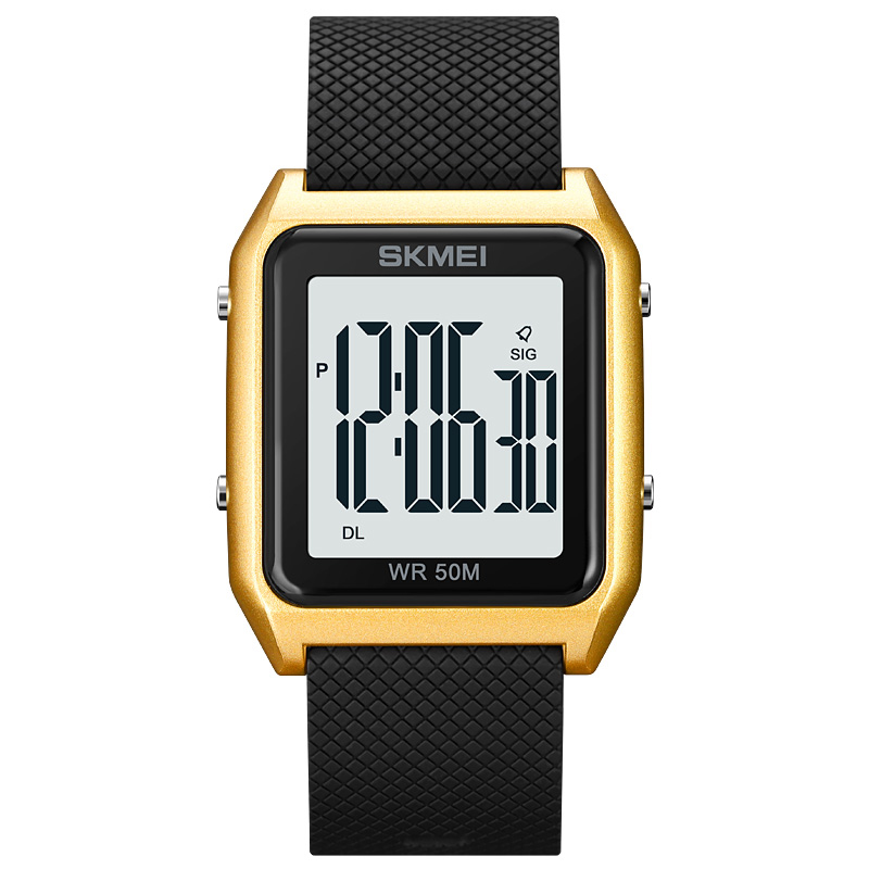 Skmei, механізм Електронний, корпус 44 х 36, матеріали Полімер / Каучук, колір Золотистий / Чорний, форма Прямокутна, стиль Спортивний, Сasual, індикація Електронний, тип кріплення Ремінець, водозахист 50 м, скло Полімерне