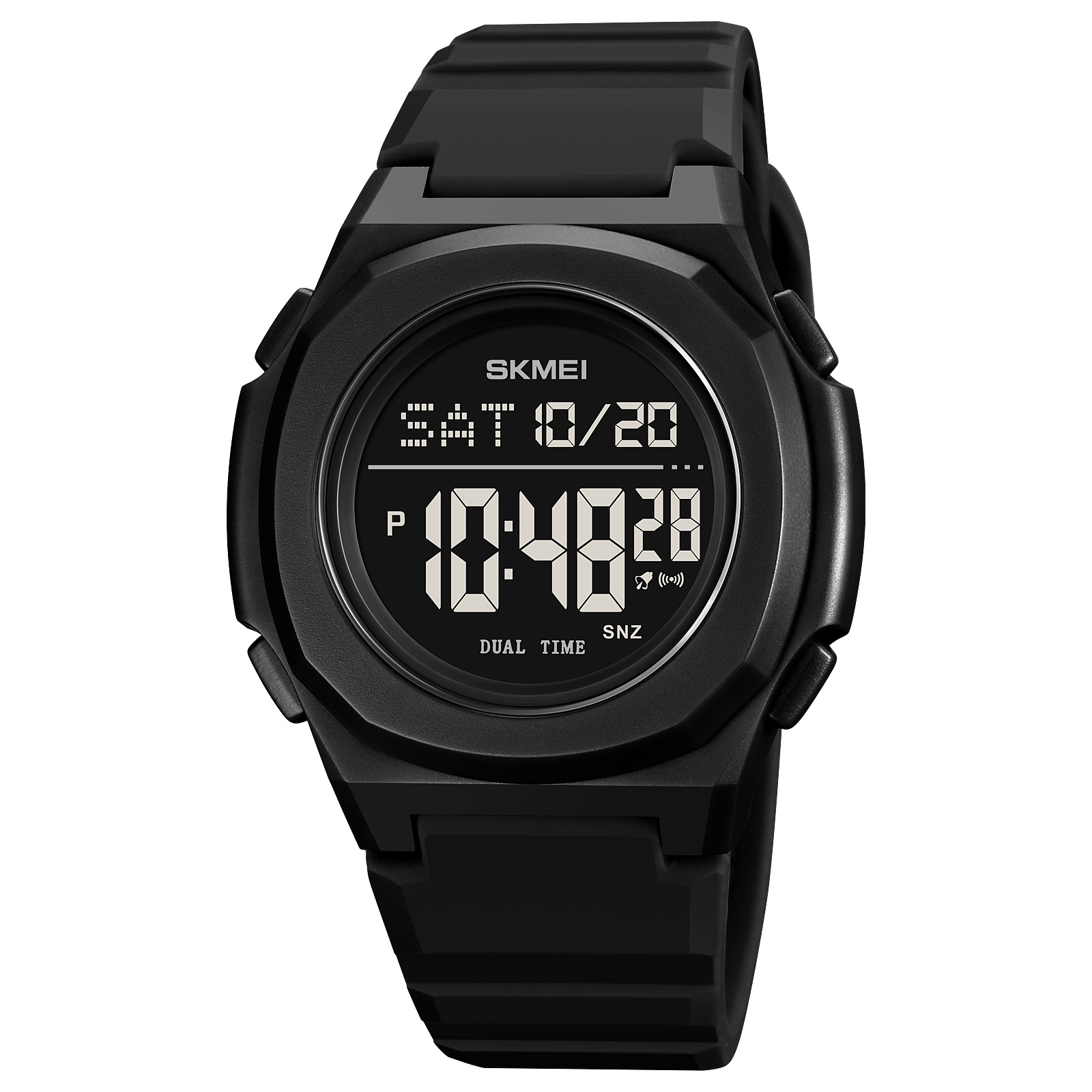 Skmei, механізм Електронний, корпус 47 х 44, матеріали Полімер / Каучук, колір Чорний, форма Кругла, стиль Спортивний, індикація Електронний, тип кріплення Ремінець, водозахист 50 м, скло Полімерне