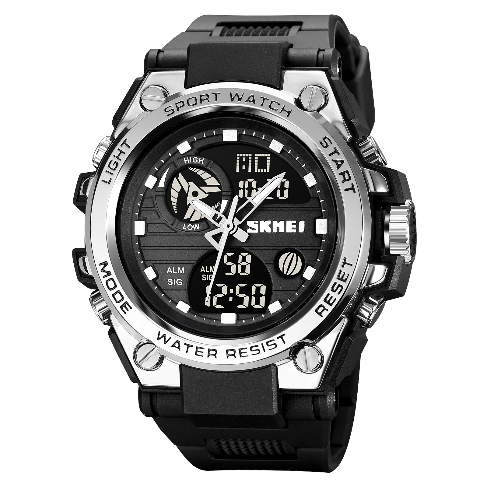 Skmei, механізм Кварцовий, корпус 50,6 х 52, матеріали Метал, Полімер / Каучук, колір Сріблястий / Чорний, форма Кругла, стиль Спортивний, індикація Стрілочно-електронний, тип кріплення Ремінець, водозахист 50 м, скло Полімерне