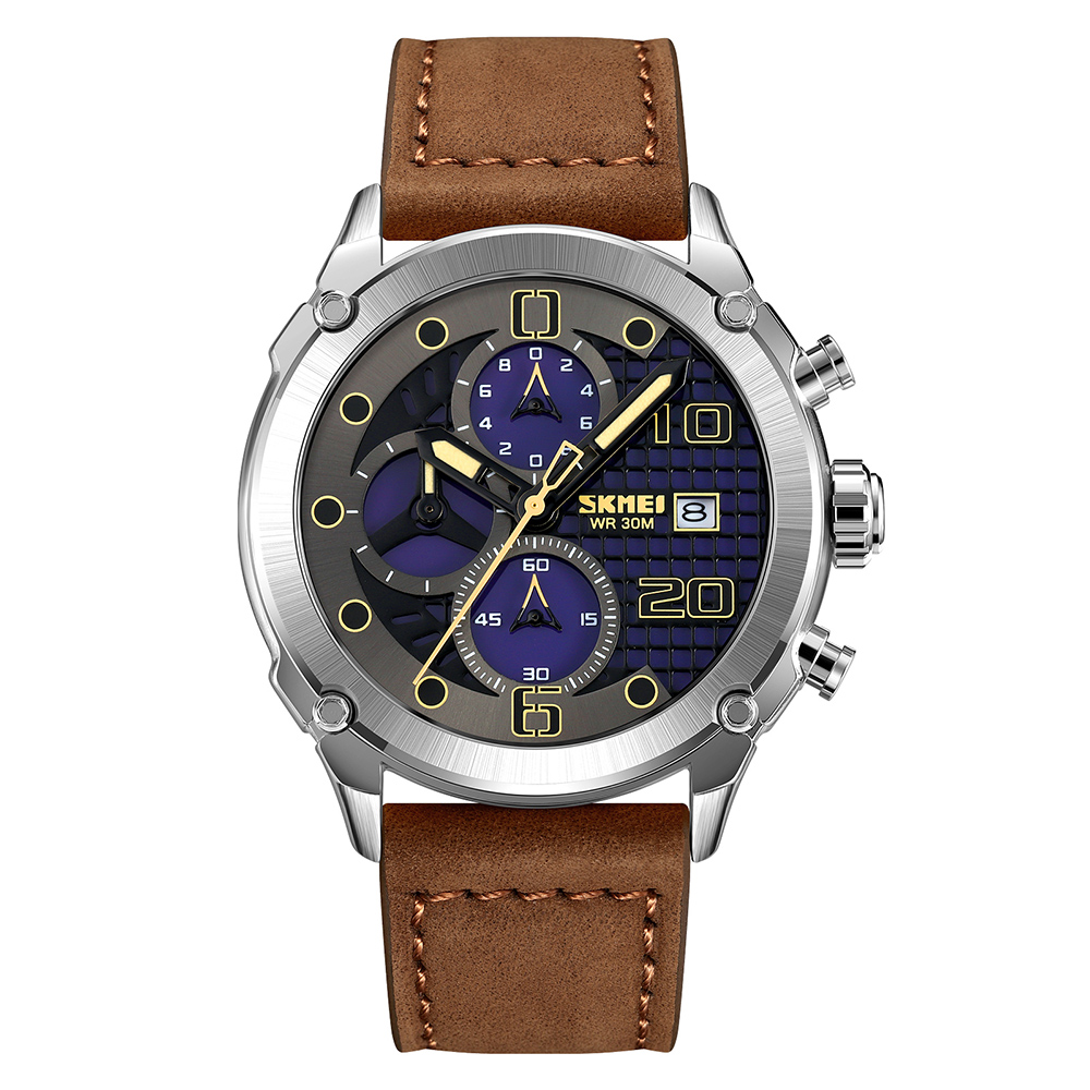 Skmei, механізм Кварцовий, корпус 47 х 47, матеріали Метал / Шкіра, колір Cріблястий / Коричневий, форма Кругла, стиль Класичний, індикація Стрілочний, тип кріплення Браслет, водозахист 50 м, скло Мінеральне
