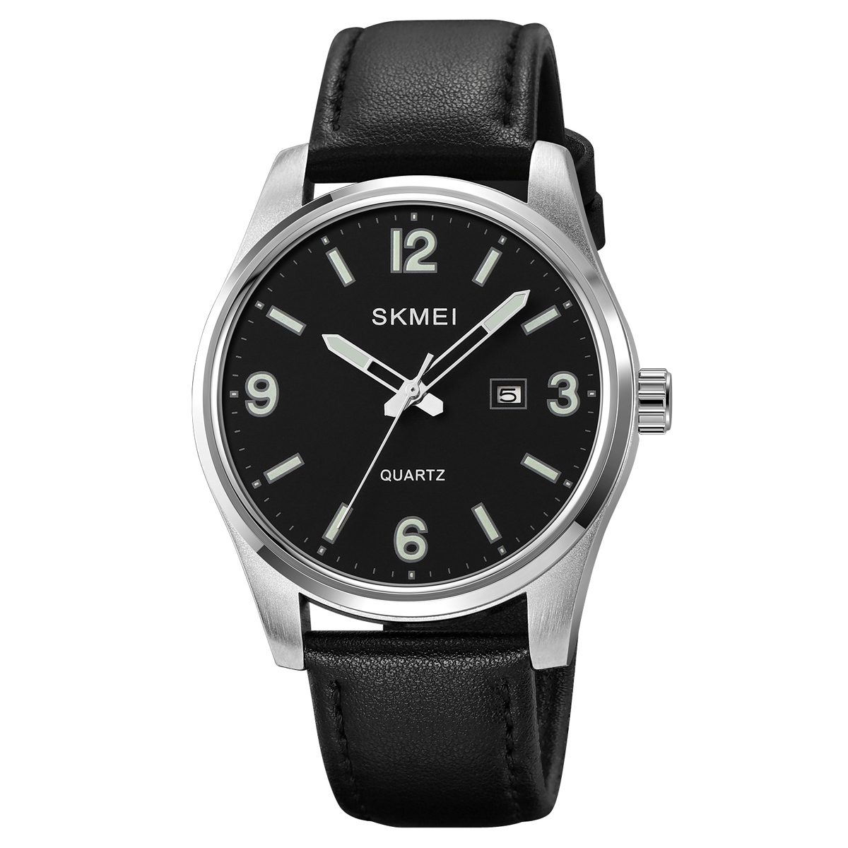 Skmei, механізм Кварцовий, корпус 52 х 44, матеріали Метал / Шкіра, колір Сріблястий / Чорний, форма Кругла, стиль Сasual, Класичний, індикація Стрілочний, тип кріплення Ремінець, водозахист 30 м, скло Мінеральне