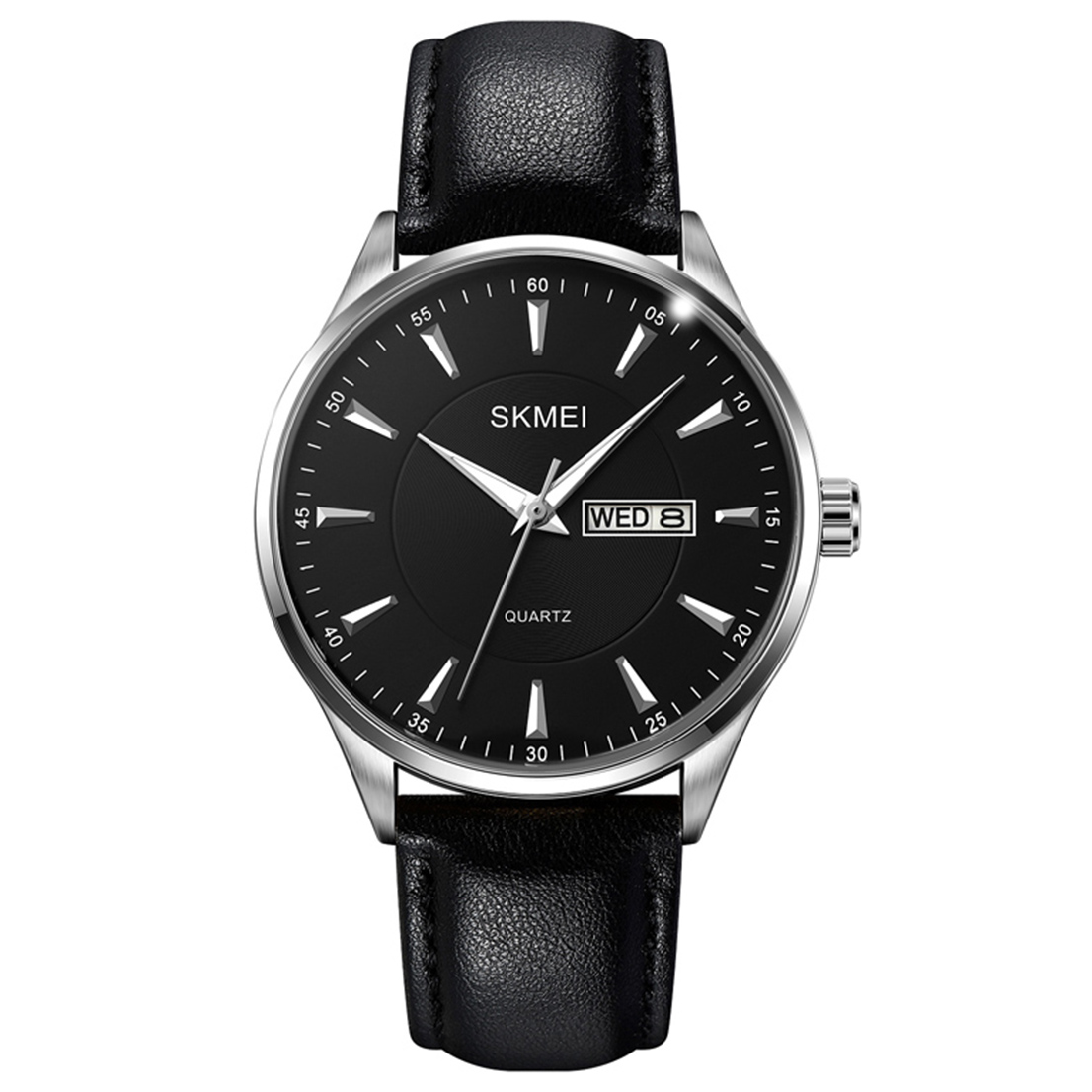 Skmei, механізм Кварцовий, корпус 45,5 х 40, матеріали Метал / Шкіра, колір Сріблястий / Чорний, форма Кругла, стиль Класичний, індикація Стрілочний, тип кріплення Ремінець, водозахист 30 м, скло Мінеральне