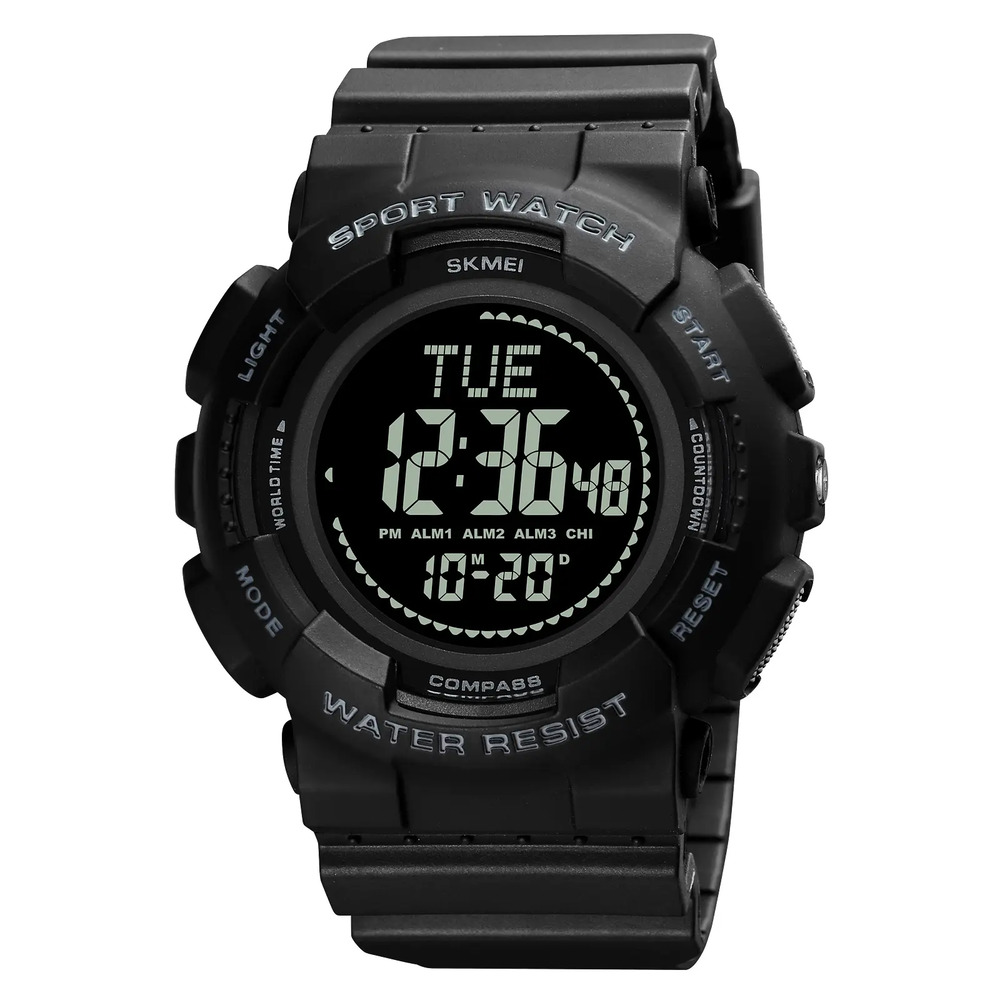 Skmei, механізм Електронний, корпус 56 х 52, матеріали Полімер / Каучук, колір Чорний, форма Кругла, стиль Спортивний, Сasual, індикація Електронний, тип кріплення Ремінець, водозахист 50 м, скло Полімерне