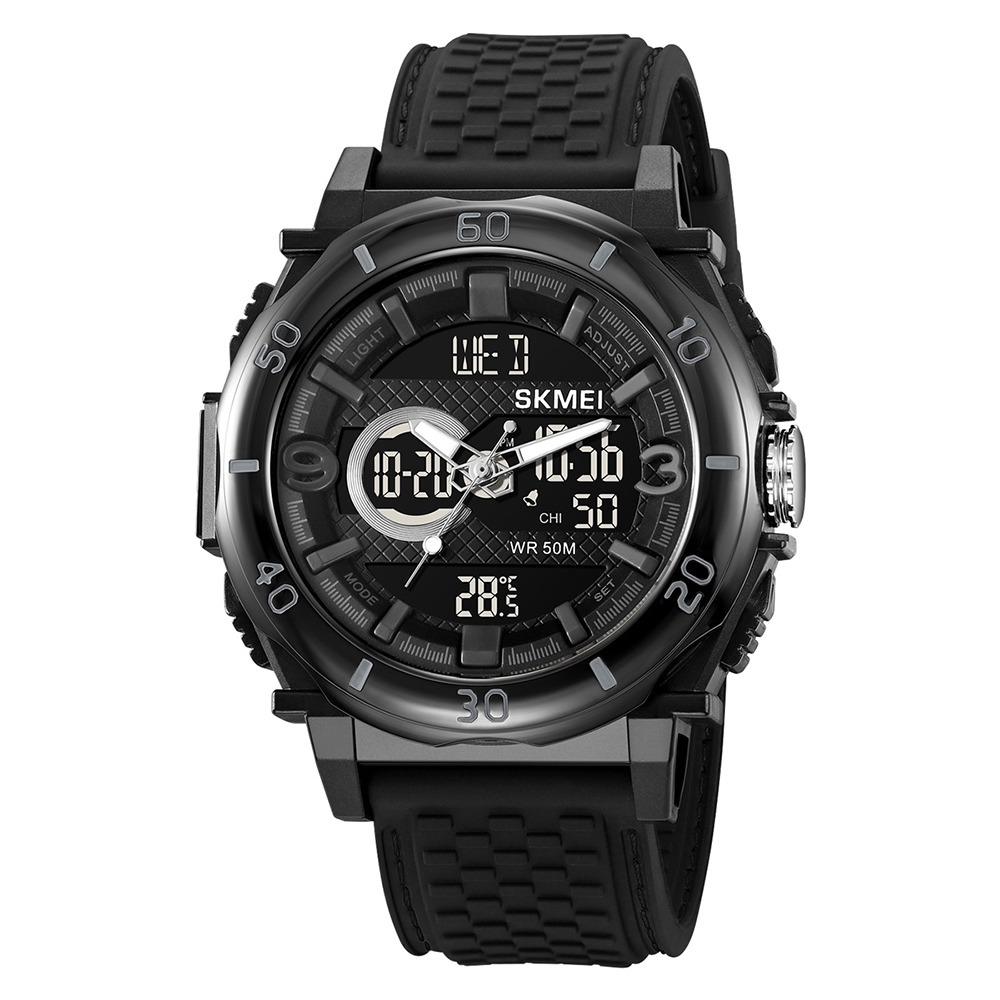Skmei, механізм Кварцовий, корпус 60 х 52,5, матеріали Полімер / Силікон, колір Чорний, форма Кругла, стиль Спортивний, Сasual, індикація Стрілочно-електронний, тип кріплення Ремінець, водозахист 50 м, скло Пластикове