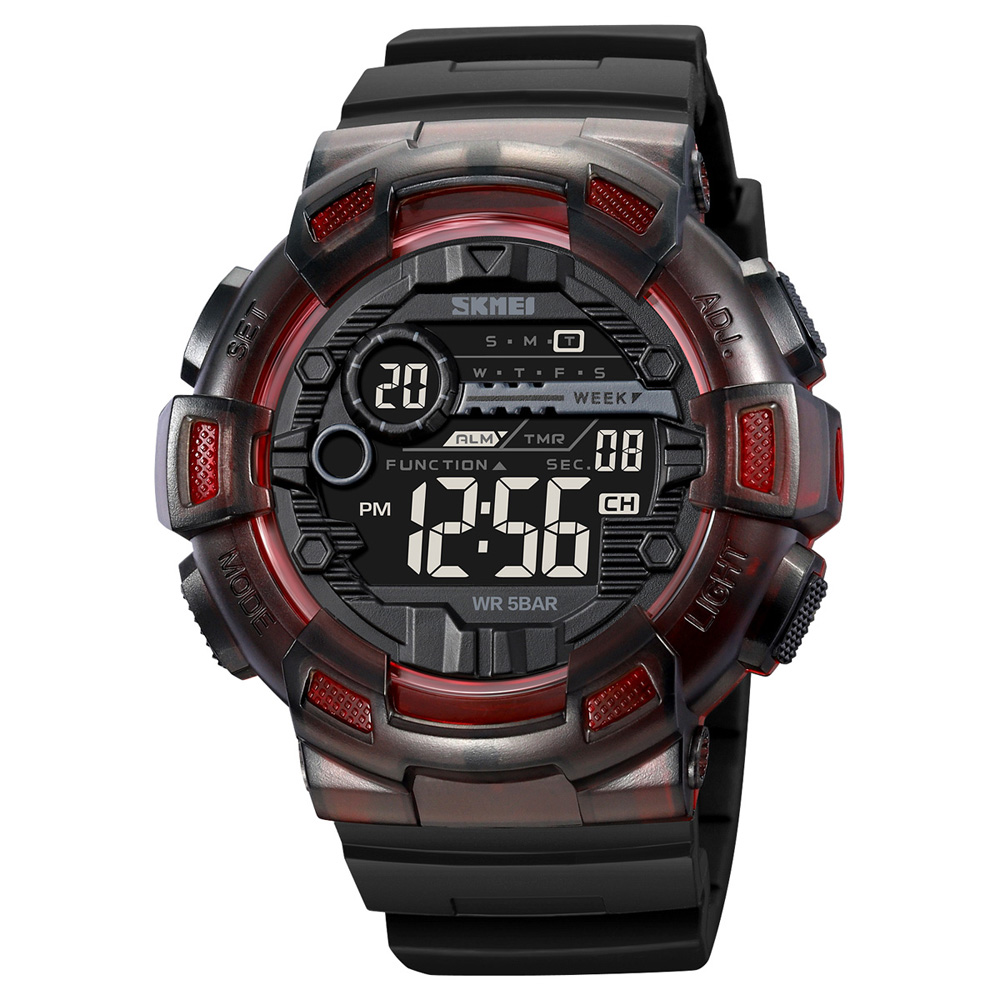 Skmei, механізм Електронний, корпус 53 х 50,7, матеріали Полімер / Каучук, колір Чорний червоний / Чорний, форма Кругла, стиль Спортивний, Сasual, індикація Електронний, тип кріплення Ремінець, водозахист 50 м, скло Полімерне