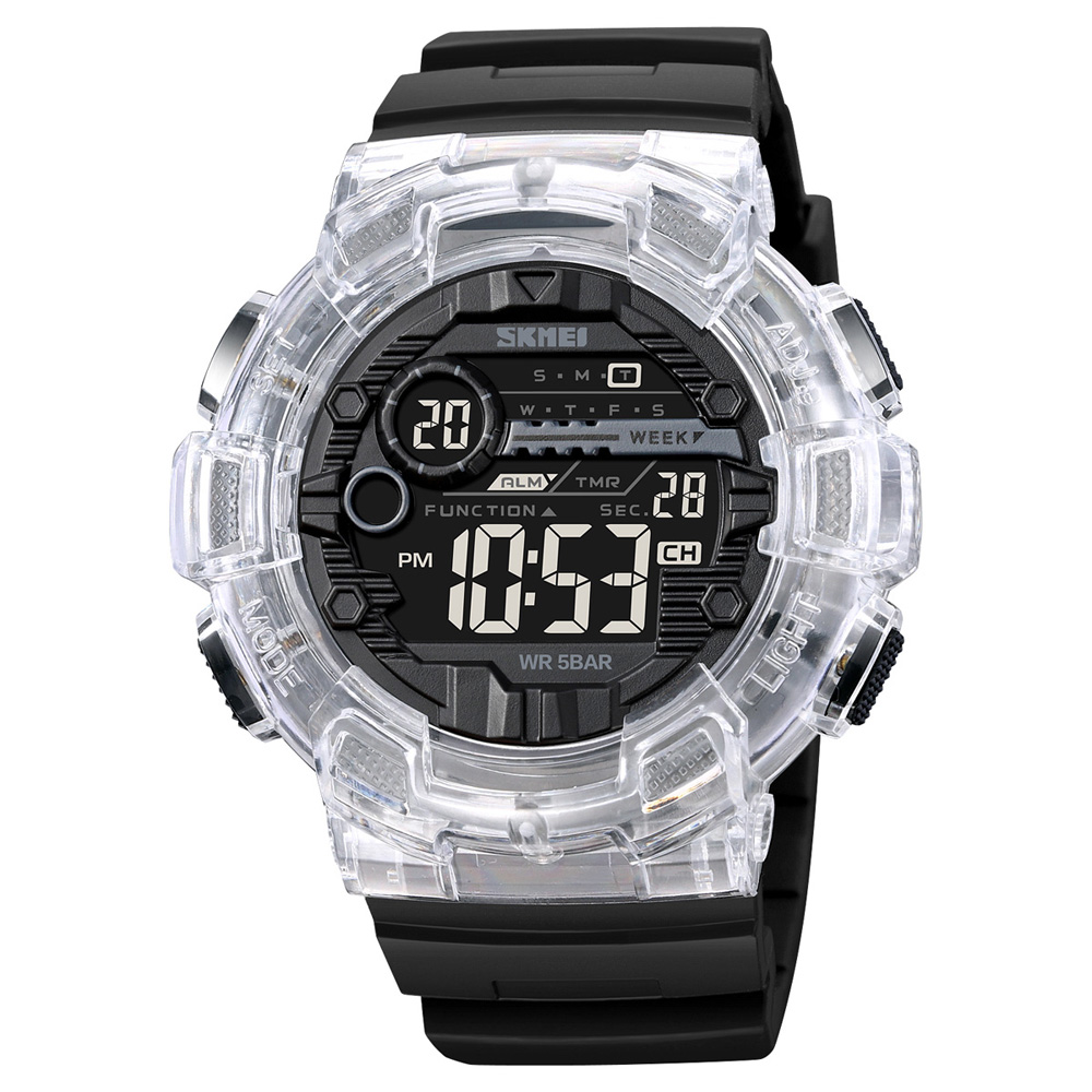Skmei, механізм Електронний, корпус 53 х 50,7, матеріали Полімер / Каучук, колір Білий / Чорний, форма Кругла, стиль Спортивний, Сasual, індикація Електронний, тип кріплення Ремінець, водозахист 50 м, скло Полімерне