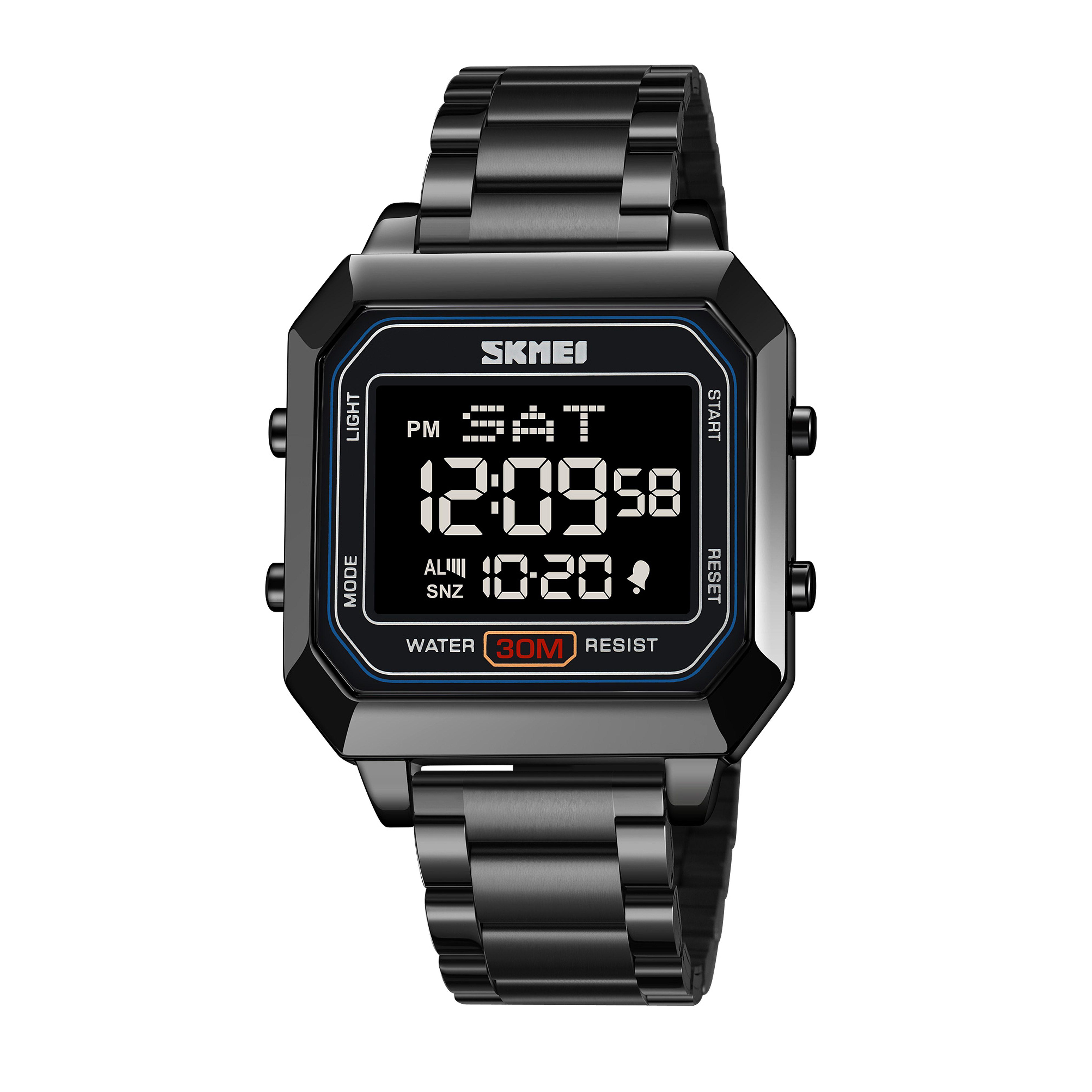Skmei, механізм Електронний, корпус 50 х 40, матеріали Метал / Нержавіюча сталь, колір Чорний, форма Квадратна, стиль Сasual, індикація Електронний, тип кріплення Браслет, водозахист 30 м, скло Полімерне