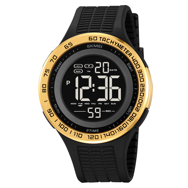 Skmei, механізм Електронний, корпус 47 х 46, матеріали Цинковий сплав / Силікон, колір Золотистий / Чорний, форма Кругла, стиль Спортивний, Сasual, індикація Електронний, тип кріплення Ремінець, водозахист 30 м, скло Полімерне