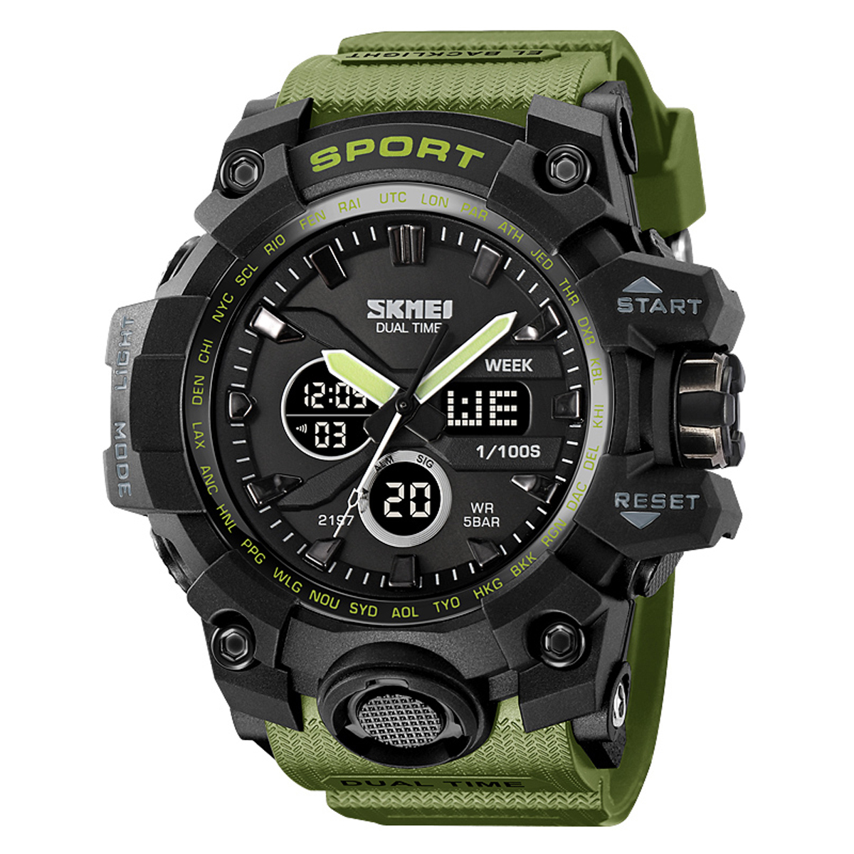 Skmei, механізм Електронний, корпус 54,8 х 56,5, матеріали Поліуретан, колір Чорний / Зелений, форма Кругла, стиль Спортивний, Сasual, індикація Стрілочно-електронний, тип кріплення Ремінець, водозахист 50 м, скло Полімерне