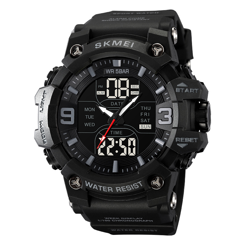 Skmei, механізм Кварцовий, корпус 60 х 58, матеріали Пластик / Каучук, колір Чорний, форма Кругла, стиль Спортивний, індикація Стрілочно-електронний, тип кріплення Ремінець, водозахист 50 м, скло Мінеральне