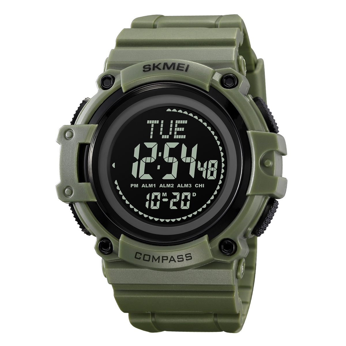 Skmei, механізм Електронний, корпус 52,4 х 55,2, матеріали Полімер / Поліуретан, колір Зелений, форма Кругла, стиль Спортивний, Сasual, індикація Стрілочно-електронний, тип кріплення Ремінець, водозахист 50 м, скло Полімерне