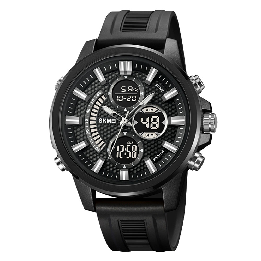 Skmei, механізм Кварцовий, корпус 46,3 х 50, матеріали Цинковий сплав / Каучук, колір Чорний, форма Кругла, стиль Спортивний, Сasual, індикація Стрілочно-електронний, тип кріплення Ремінець, водозахист 50 м, скло Пластикове