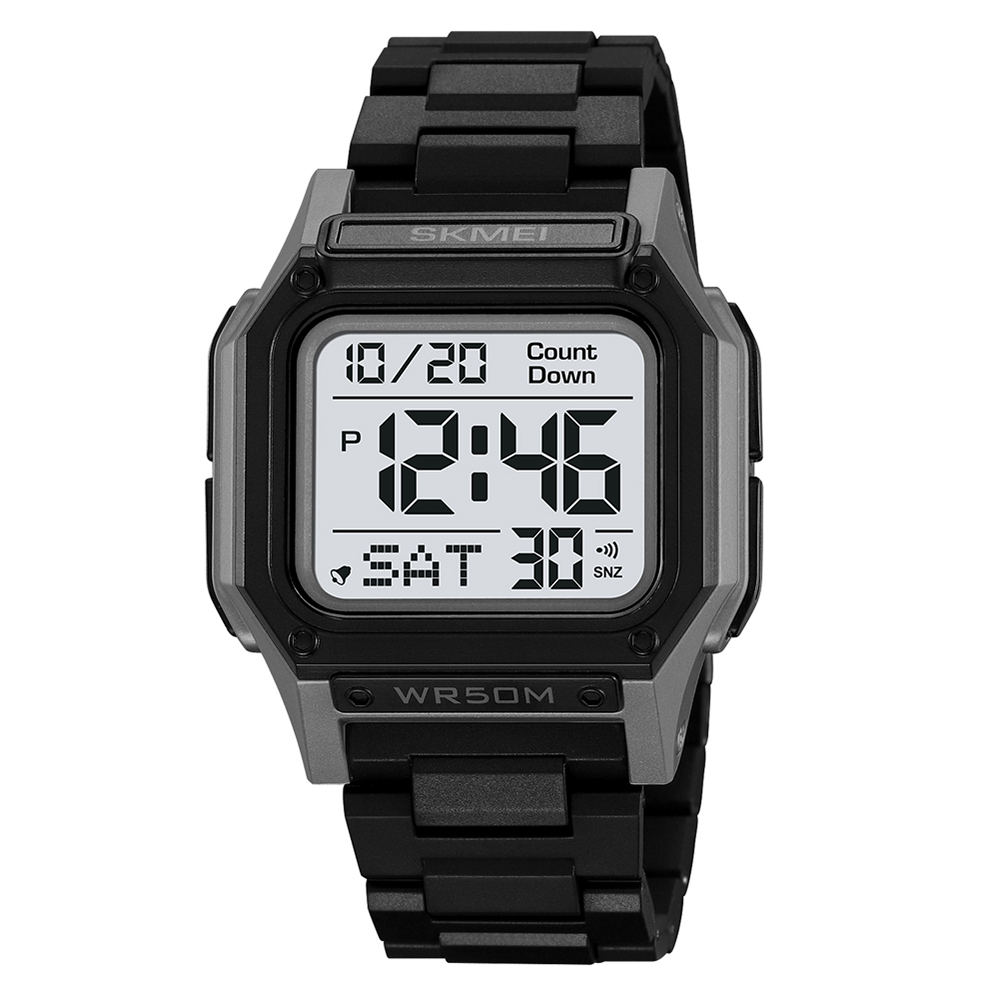 Skmei, механізм Електронний, корпус 46,8 х 52, матеріали Поліуретан, колір Сірий / Чорний / Чорний, форма Прямокутна, стиль Спортивний, Сasual, індикація Електронний, тип кріплення Ремінець, водозахист 50 м, скло Пластикове