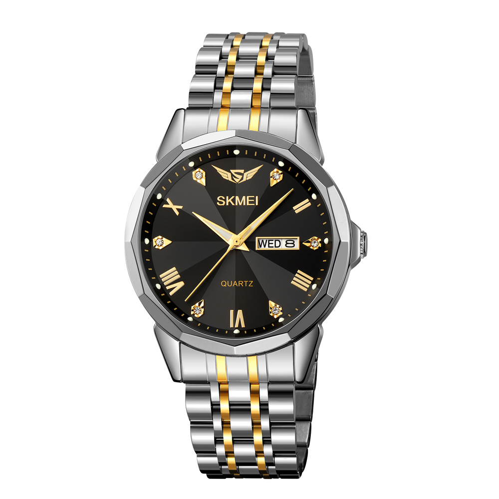 Годинники Skmei 2291TGDBK поєднують у собі стиль і функціональність. Їх водонепроникність до 30 метрів забезпечує надійність у різних умовах. Корпус виготовлений з металу сріблястого кольору, а ремінець — з нержавіючої сталі в золотистому та сріблястому відтінках. Годинники мають кварцовий механізм та стрілочний циферблат з арабськими і римськими цифрами, що дозволяє легко зчитувати час. Додаткова функція календаря робить їх ще більш практичними. Стиль Casual і класичний дизайн роблять цей аксесуар універсальним для будь-якого образу. Гарантія на годинники становить 12 місяців, а їх вага — 102 г.