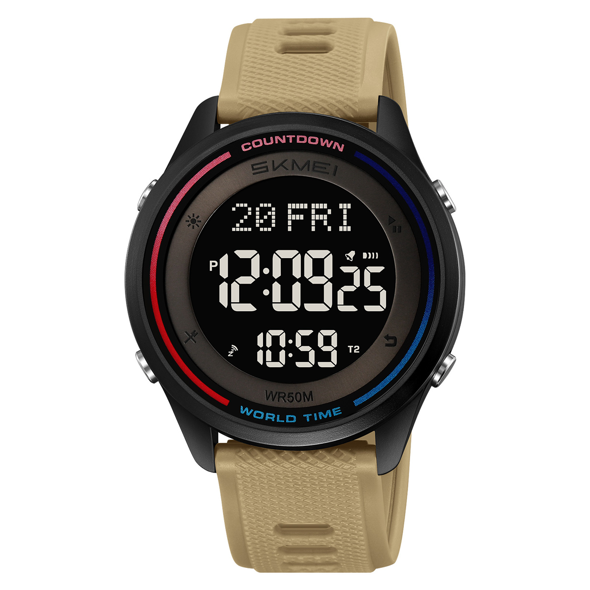 Skmei, механізм Електронний, корпус 51 х 45, матеріали Поликарбонат / Силікон, колір Чорний / Хакі, форма Кругла, стиль Спортивний, індикація Електронний, тип кріплення Ремінець, водозахист 50 м, скло Мінеральне