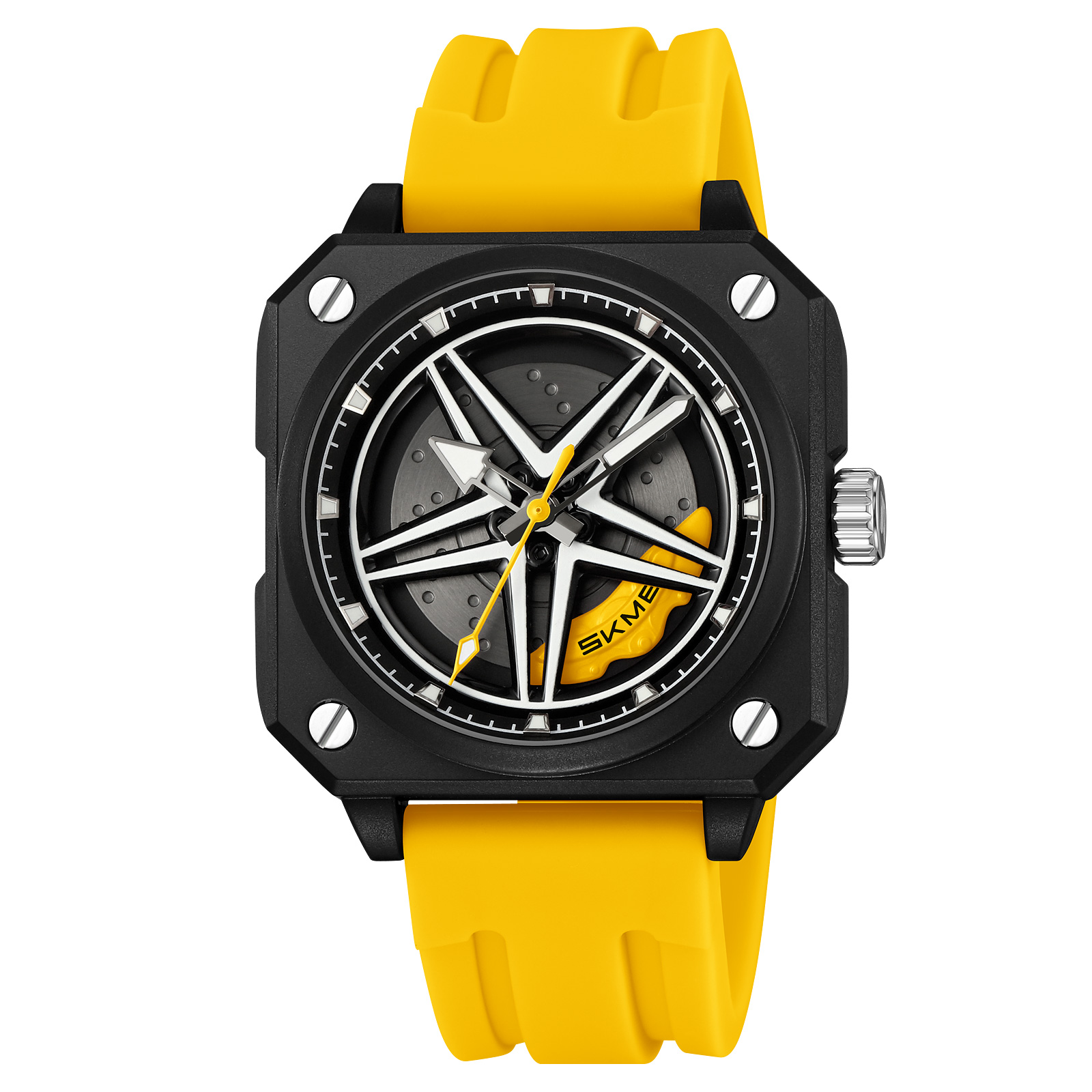 Skmei, механізм Кварцовий, корпус 49 х 42, матеріали Поликарбонат / Силікон, колір Чорний / Жовтий, форма Квадратна, стиль Спортивний, індикація Стрілочний, тип кріплення Ремінець, водозахист 30 м, скло Мінеральне
