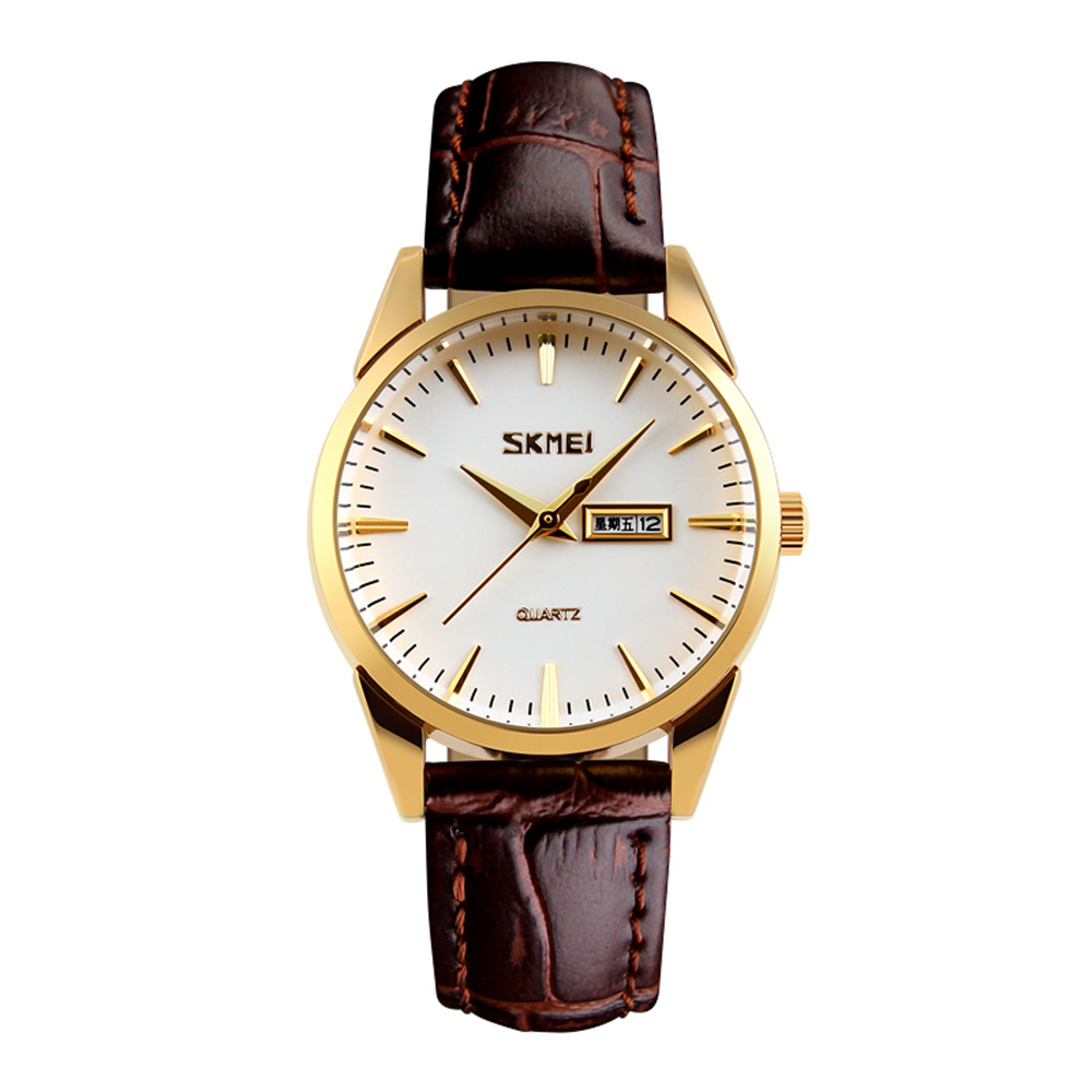 Skmei, механізм Кварцовий, корпус 40 х 32, матеріали Метал / Шкіра, колір Золотистий / Коричневий, форма Кругла, стиль Класичний, індикація Стрілочний, тип кріплення Ремінець, водозахист 30 м, скло Мінеральне
