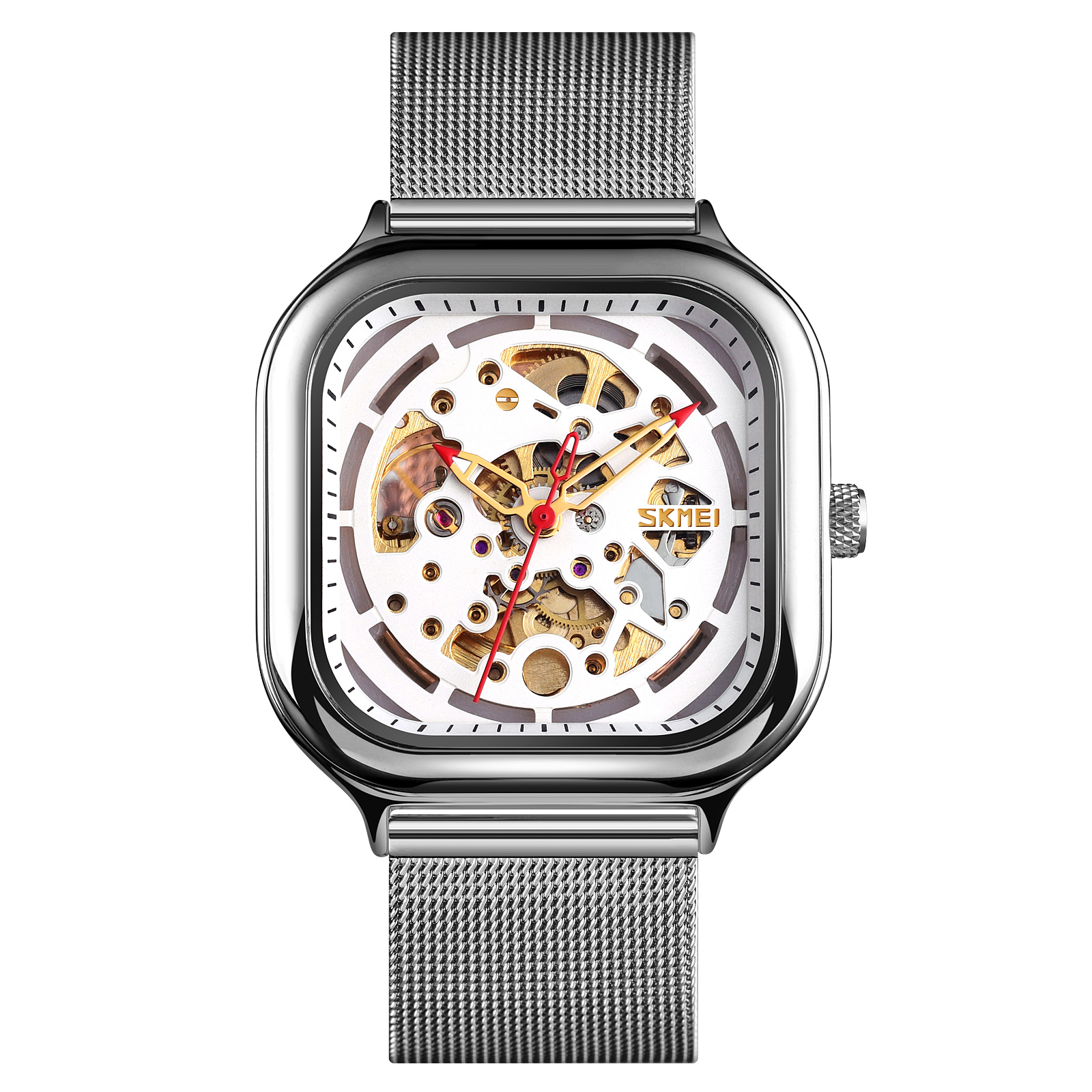 Skmei, механізм Кварцовий, корпус 48 х 41, матеріали Метал / Нержавіюча сталь, колір Сріблястий, форма Квадратна, стиль Сasual, Класичний, індикація Стрілочний, тип кріплення Браслет, водозахист 30 м, скло Мінеральне