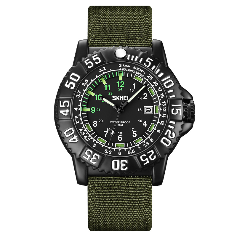 Skmei, механізм Кварцовий, корпус 50 х 48, матеріали Метал / Нейлон, колір Чорний / Темно-зелений, форма Кругла, стиль Спортивний, Сasual, індикація Стрілочний, тип кріплення Ремінець, водозахист 30 м, скло Полімерне
