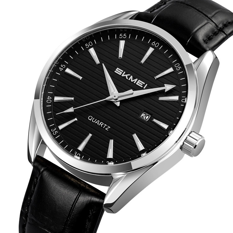 Skmei, механізм Кварцовий, корпус 43х12, матеріали Сталь / Шкіряний / Метал, колір Сріблястий / Чорний, форма Круглий, стиль Класичний, індикація Аналоговий (стрілочний), тип кріплення Ремінець, скло Мінеральне