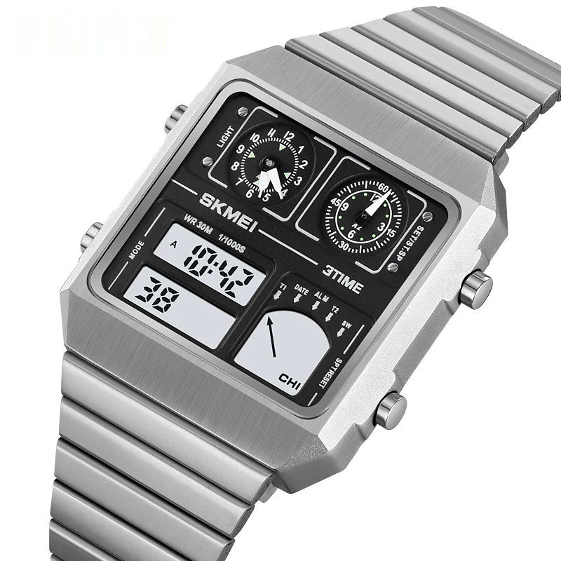 Skmei, механізм Кварцовий, корпус 45х14, матеріали Полікарбонат / Сталевий / Метал, колір Сріблястий, форма Прямокутний, стиль Спортивний, індикація Цифровий (електронний), тип кріплення Браслет, скло Мінеральне