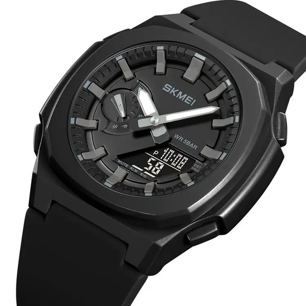 Skmei, механізм Кварцовий, корпус 46x45х11, матеріали Сталь / Каучуковий / Метал, колір Чорний, форма Круглий, стиль Спортивний, індикація Комбінований (аналогово-стрілочний), тип кріплення Браслет, скло Мінеральне