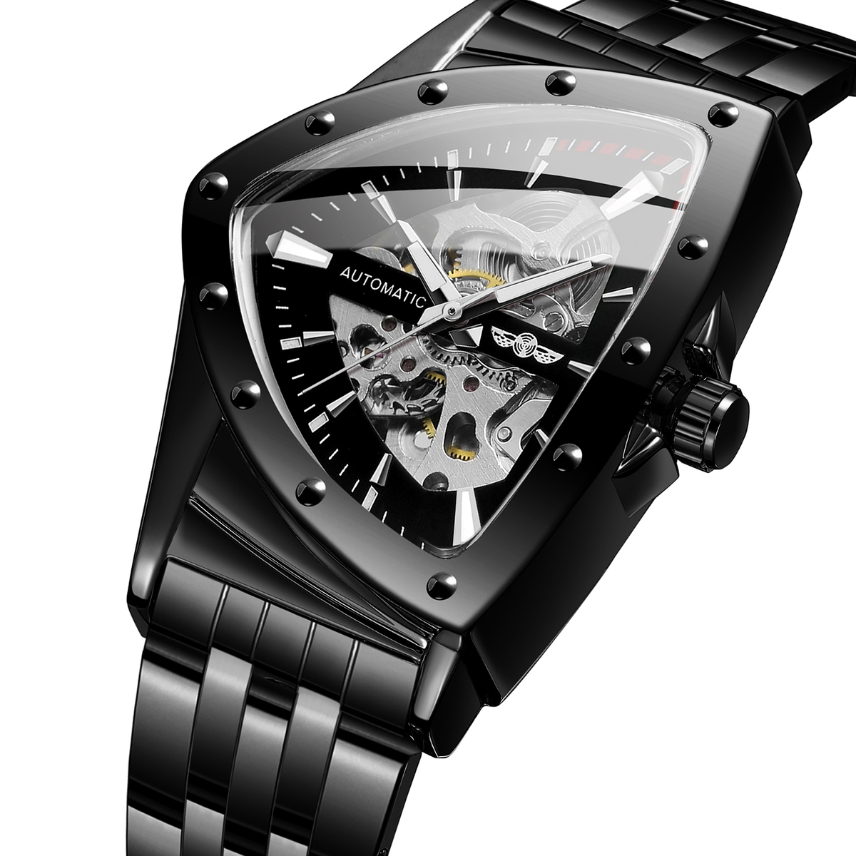 Winner, механізм Механічний з автопідзаводом, корпус 42х14, матеріали Сталь / Сталевий / Метал, колір Чорний, форма Трикутний, стиль Класичний, індикація Аналоговий (стрілочний), тип кріплення Браслет, скло Мінеральне