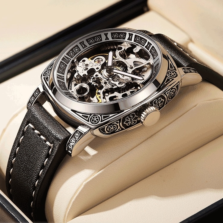 WishDoIt, механізм Механічний з автозаводом, корпус 41х15, матеріали Сталь / Шкіряний / Метал, колір Сріблястий / Чорний, форма Круглий, стиль Класичний, індикація Аналоговий (стрілочний), тип кріплення Ремінець, скло Мінеральне